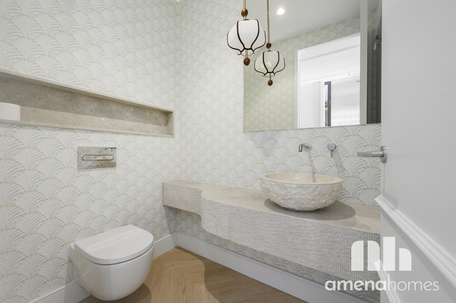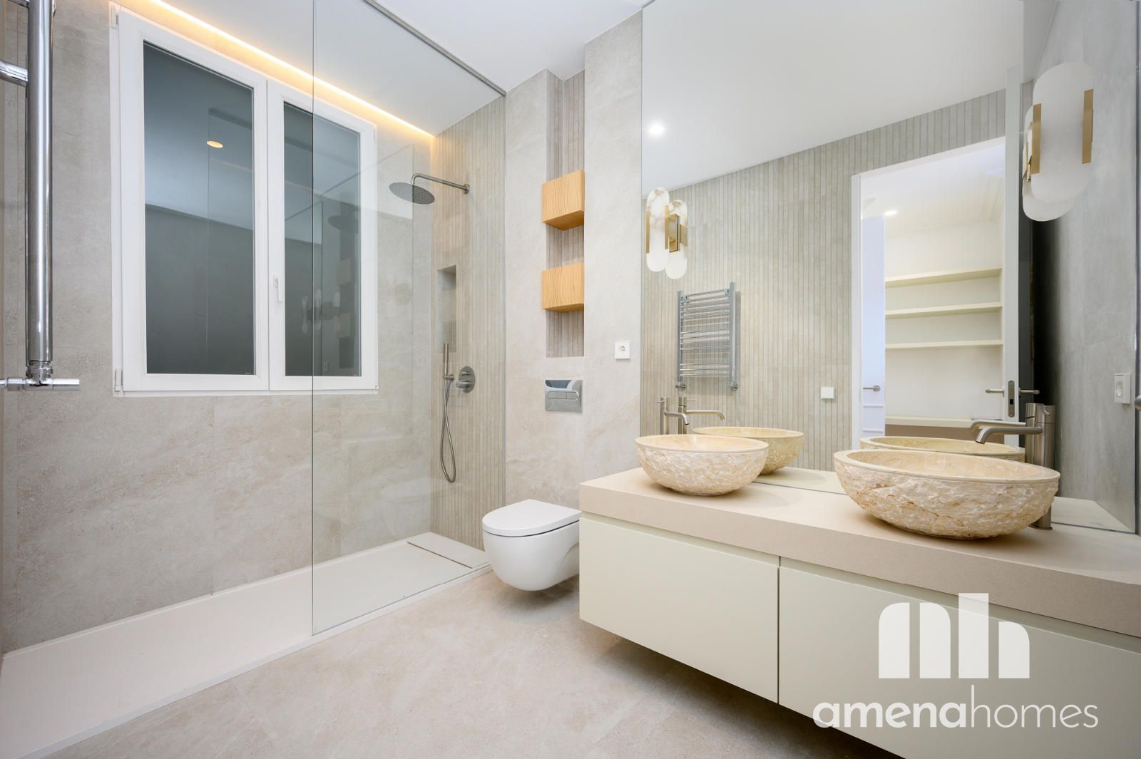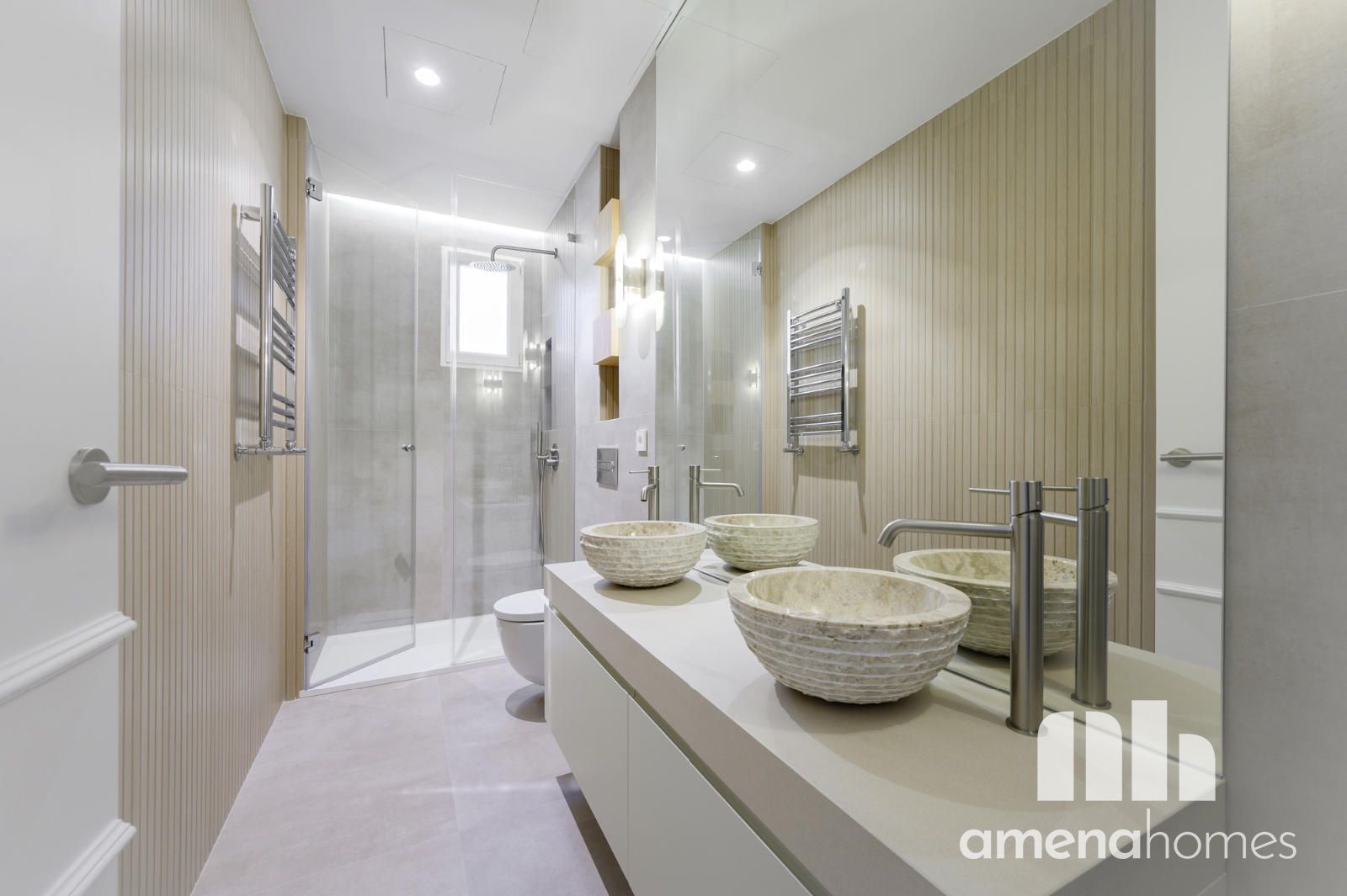 Los baños destacan por su diseño elegante, con piezas exclusivas, lavabos de piedra y una cuidada iluminación que refuerza la estética sofisticada de toda la vivienda.
